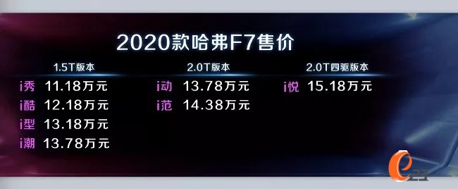 此次上市的2020款哈弗F7共推出7個版本,搭載1.5GDIT/2.0GDIT 7DCT黃金動力組合。1.5GDIT車型包括i秀、i酷、i型、i潮四款車型,2.0GDIT車型包括i動、i范、i悅三款車型,新車的售價區間為11.18萬-15.18萬元。