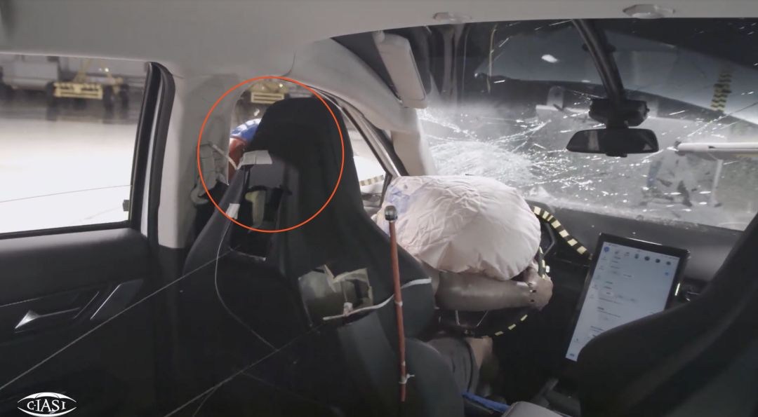 在碰撞完成后,安全帶對(duì)于假人的約束不夠,導(dǎo)致假人頭部往后“回彈”的時(shí)候后腦勺有可能撞到門框,因此盡管小鵬G3的車身強(qiáng)度足夠,但是也只能獲得A的評(píng)價(jià),這也是吃了最低配車型沒有側(cè)氣簾的虧啊!(G3從次低配起才有側(cè)氣簾)