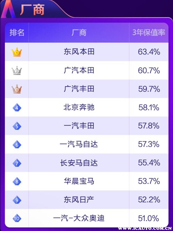 在國內(nèi)汽車廠商的保值率排行榜中,東風(fēng)本田、廣汽本田、廣汽豐田包攬了前三名的寶座,由此可見日系車在國內(nèi)汽車市場(chǎng)上受歡迎程度還是非常高的,這幾大品牌旗下的車型基本上都不愁賣,如果大家買車是用于過度使用,在三五年后還準(zhǔn)備換新車的,那么為了不虧太多的錢,建議大家優(yōu)先考慮本田、豐田這兩大品牌。