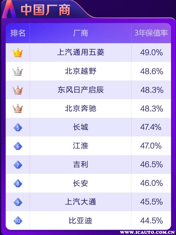因?yàn)閲a(chǎn)車在保值率方面的表現(xiàn)比較差,所以相關(guān)機(jī)構(gòu)為國產(chǎn)車/國產(chǎn)車企專門設(shè)置了榜單排名,其中上汽通用五菱以49%的3年保值率獲得第一名的寶座,比較讓人驚訝的是北京越野居然排到了第二名,而像長(zhǎng)城、吉利、長(zhǎng)安等一線自主品牌卻均無緣前三,這個(gè)結(jié)果還是比較出乎意料的,看來賣得好的車保值率也未必高。