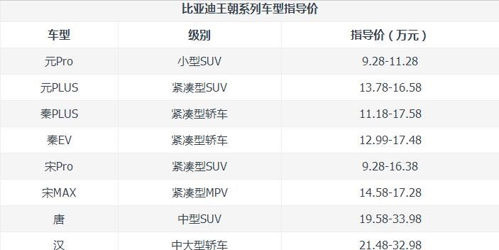比亞迪王朝系列目前在售車型包括“秦、唐、宋、元、漢”這幾大車系,其中定位比較高端的車型主要為比亞迪漢、比亞迪唐,車型的具體售價可以參照以下表格: