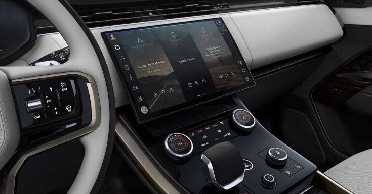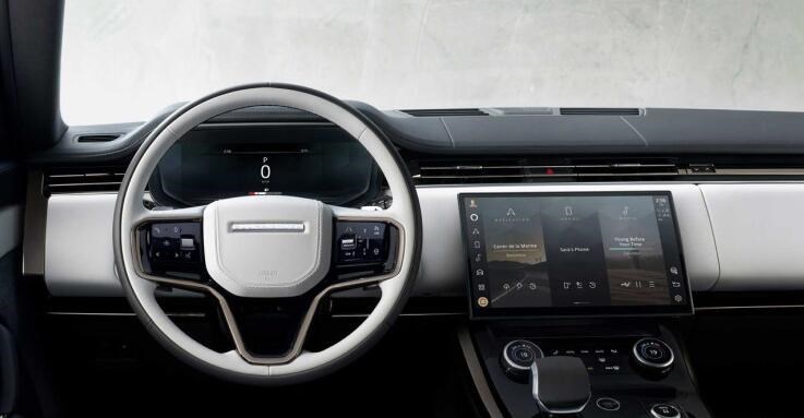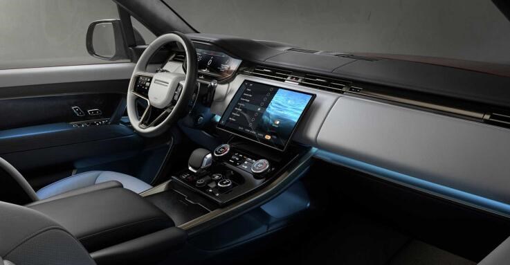 內飾部分,全新攬勝運動版和全新攬勝的差異并不明顯,依舊配備了13.7英寸全液晶儀表盤,還有13.1英寸懸浮式中控屏,中控臺整體的造型設計稍有不同,新車采用的是三輻式多功能方向盤,并且空調控制區有所抬高,設置了無線充電面板。