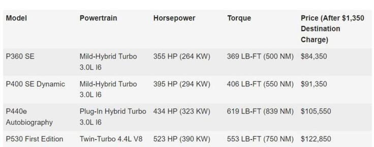 動力方面,新車推出了汽油、柴油以及插混三種版本,汽油版擁有三種版本,其中P400與P360將搭載分為高/低功率的3.0T渦輪增壓直列六缸發動機,并加入了48V輕混系統,P530車型則是搭載一個4.4T雙渦輪增壓V8發動機。混動版分為P510e與P440e兩種版本,分別搭載了高/低功率的3.0T渦輪增壓直列六缸發動機,并加入了電機組成插混系統,所有車型均匹配8速自動變速箱以及智能四驅系統。