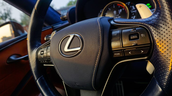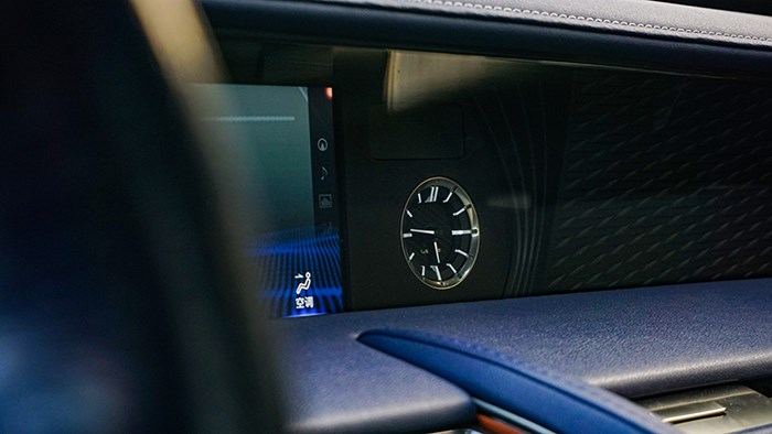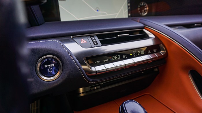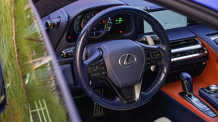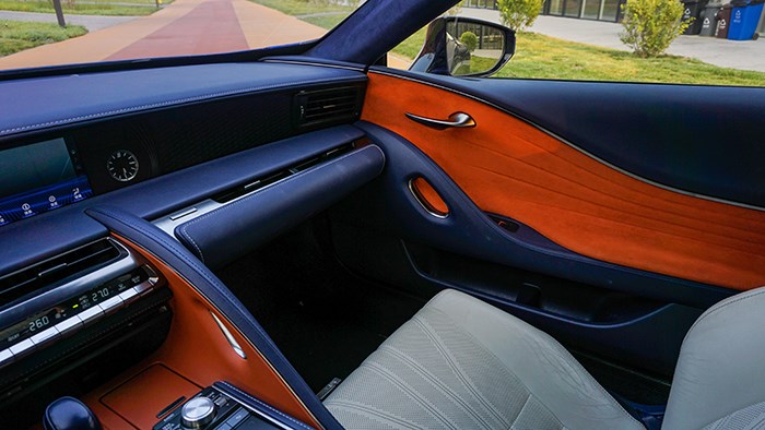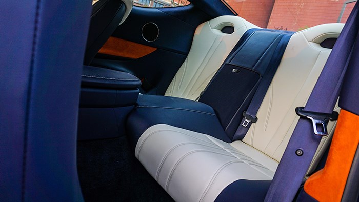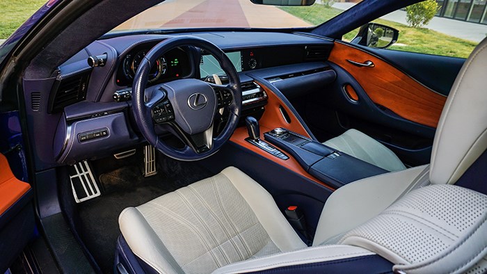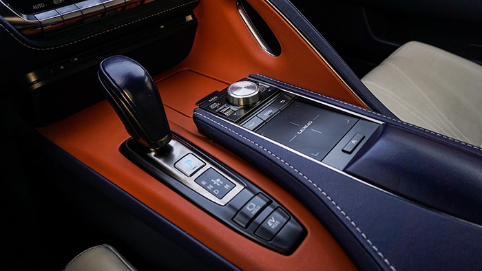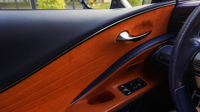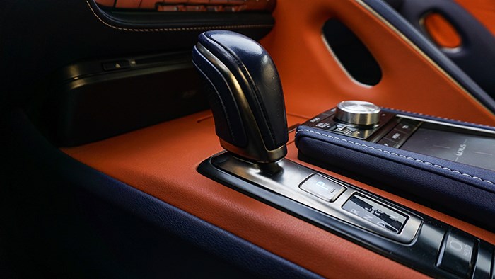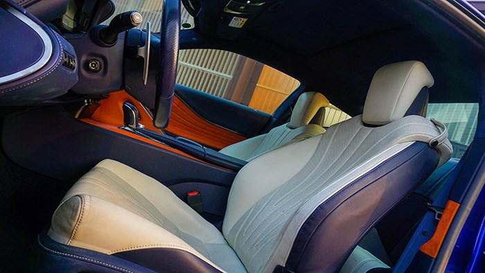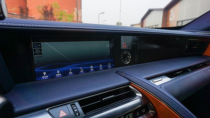 內飾方面,LC500h還是極具風韻的,而且內飾的選材和工藝都非常精細。拉開大尺寸的無框車門,上車的動作是地地道道的跑車感覺。這臺inspiration series 特別版選用撞色設計,很有獨特的品味。珊瑚藍配合橙色及白色真皮運動座椅,給人驚艷的效果。