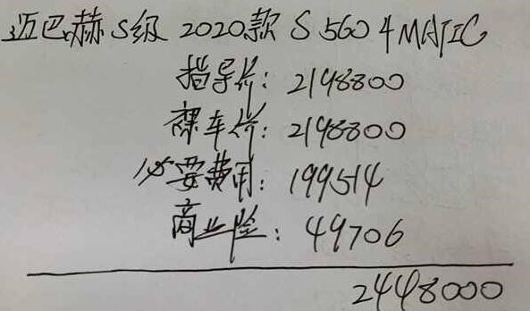 邁巴赫S560現階段在售車型2020款 S 560 4MATIC,同時也處于停產在售狀態,官方指導價219.88萬,全款購車包括車輛購置稅、交強險、車船稅、商業險、上牌費以及其它手續費,最后這款邁巴赫S560落地價244.80萬元。