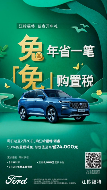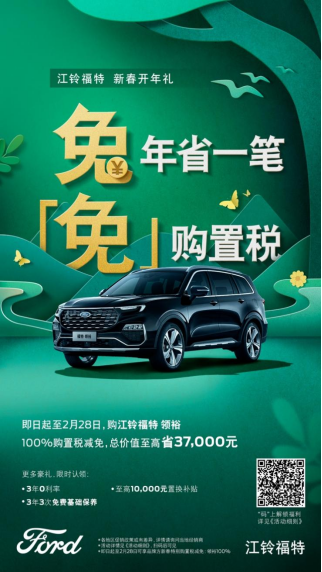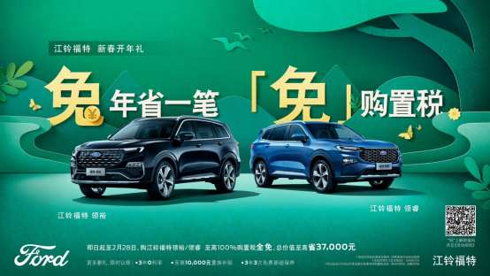 ? 面對汽車行業購置稅補貼政策已終止的情況,江鈴福特科技誠意不減!江鈴福特科技推出“兔年省一筆 免購置稅”新春開年禮活動。