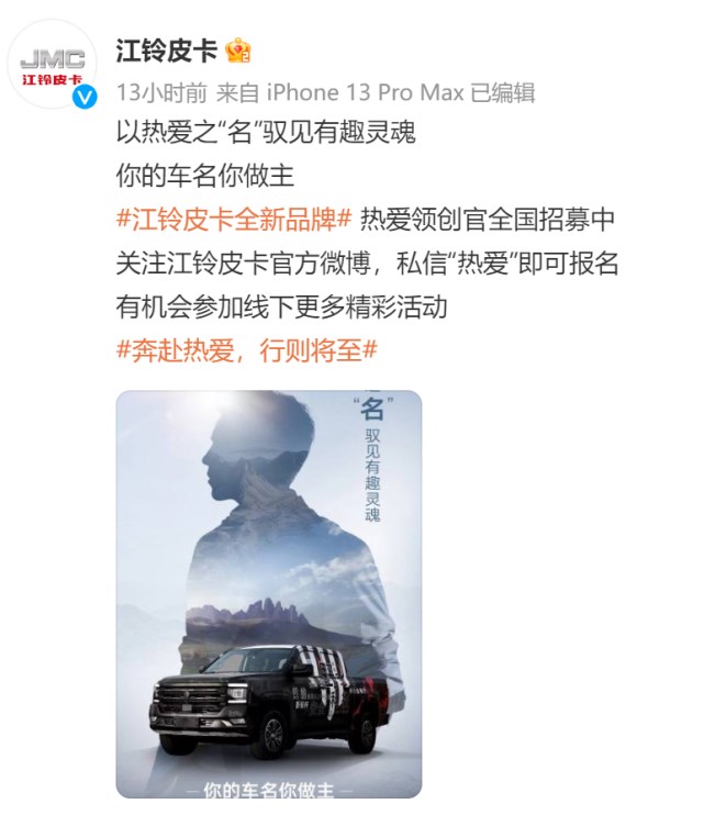 站在全新品牌即將發(fā)布的新起點,江鈴皮卡延續(xù)“以用戶為中心”的品牌理念,正式啟動江鈴皮卡全新品牌熱愛領(lǐng)創(chuàng)官招募計劃,并在江鈴皮卡官方微博正式開放招募通道。即日起,關(guān)注江鈴皮卡官方微博,私信“熱愛”即可報名,有機會成為熱愛領(lǐng)創(chuàng)官的同時還可受邀參加江鈴皮卡品牌發(fā)布會等多種精彩線下活動。
