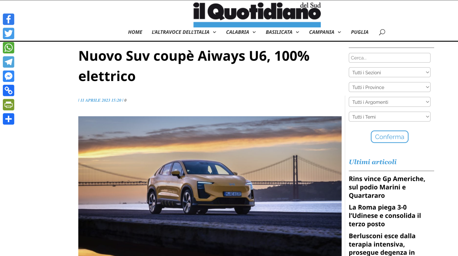 意大利媒體《il Quotidiano del Sud》:“愛馳U6可帶來非常人性化的人車交互體驗,讓座艙變得有智慧、有溫度。”