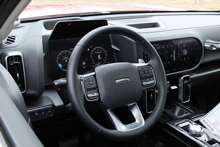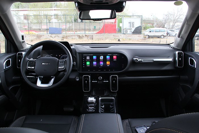 中控區域采用一塊12.3英寸大屏,在顯示色彩和細膩度方面表現不錯,所含內容也十分豐富,日常駕駛與使用的功能基本上都能涵蓋上。除了虛擬按鍵外,空調、行車影像與四驅設置了物理按鍵,以滿足不同消費者的使用習慣。這里著重表揚一下大狗的全景影像系統,畫面設計符合大多數人的使用習慣,并且車型以線條展示,可以讓操作者更易判斷實際道路情況。