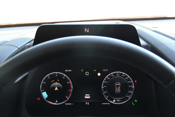 多功能儀表的設計比較有意思,分為上下兩塊,下方為液晶屏顯示,黑底白字易于讀取信息,中間的行車動畫效果畫面細膩,借助于全景攝像頭,可實時監控道路車輛情況,增強了行車安全性;上方則是單獨設計出來的檔位顯示,剛好處在方向盤與抬頭顯示之間。