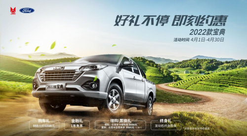 陽春四月,江鈴皮卡攜旗下2022款寶典、2023款寶典、域虎7、域虎9也特地為新老用戶準備了春日鉅惠禮遇(活動時間截止至2023年4月30日),購車禮、金融禮、置換/增購禮、終身禮等多重禮遇齊放送,最高直降13000元,助力更多用戶朋友們開啟春日美好生活。
