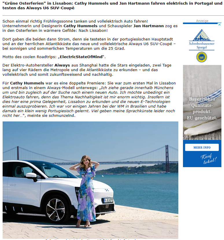 日前,愛(ài)馳旗下第二款量產(chǎn)車(chē)愛(ài)馳U6在葡萄牙首都里斯本舉辦的歐洲大型媒體試駕會(huì)上,共邀請(qǐng)了全球超160家權(quán)威媒體和各圈層KOL前來(lái)試駕。我們從德國(guó)媒體《ganz-muenchen》的報(bào)道中了解到,愛(ài)馳U6憑借綠色智能的純電實(shí)力和卓越的駕乘品質(zhì),成功收獲了德國(guó)知名KOL Cathy Hummels和德國(guó)著名演員Jan Hartmann的一致好評(píng)。