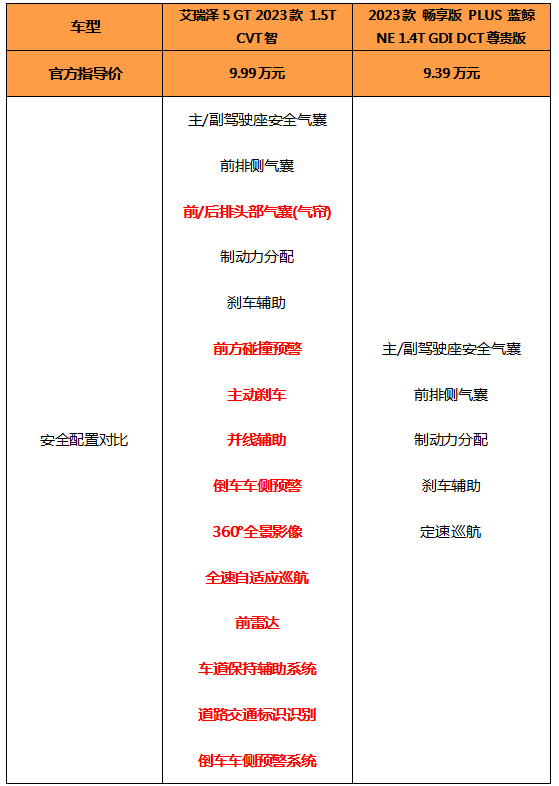 對于那些真正務實、理性的消費者而言,跟大多數“花里胡哨”的配置比起來,安全更是日常用車的重中之重。反應到車型身上,就是汽車在主被動安全配置層面的差異。為了公平起見,這里選取2023款 暢享版 PLUS 藍鯨NE 1.4T GDI DCT尊貴版和同在9萬級價位艾瑞澤5 GT 2023款 1.5T CVT智(簡稱艾瑞澤5 GT智)進行對比。