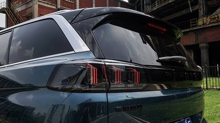 車尾部分,后排的黑色隱私玻璃,搭配上懸浮的車頂,以及橫貫尾部的黑色飾板將尾燈、尾標融為一體又與前大燈組呼應。尾燈組內部采用了更加復雜的多片式立體結構,LED光源點亮后很有高級感。