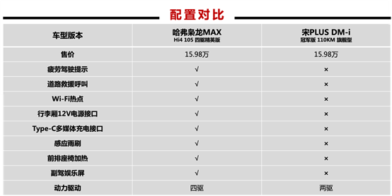 在安全配置方面,哈弗梟龍MAX全面升級(jí),哈弗梟龍MAX Hi4 105四驅(qū)精英版更是以更低的售價(jià)提供了更豐富的安全配備。多了疲勞駕駛、道路救援呼叫等功能,覆蓋了日常用車的方方面面,為駕駛者提供更全面的安全輔助。而且還是四驅(qū)動(dòng)力,為車輛提供更強(qiáng)大的動(dòng)力輸出和更穩(wěn)定的操控性能。相比之下,宋 PLUS DM-i冠軍版改款后,反而取消并線輔助/開門預(yù)警/后向碰撞預(yù)警等日常駕駛高頻使用的安全智能配置,降低了安全系數(shù),顯得不夠誠(chéng)意。