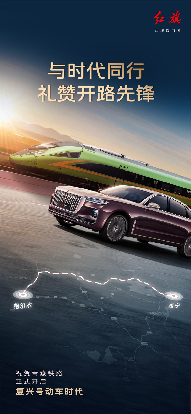 7月1日,復(fù)興號動車組在青藏鐵路西寧至格爾段投入運營,標(biāo)志著青藏鐵路正式進(jìn)入動車時代。同為中國出行領(lǐng)域的“大國重器”,紅旗H9作為國產(chǎn)C 級旗艦轎車新標(biāo)桿,傳遞出大國復(fù)興的時代共鳴,以歷久不衰的匠心品質(zhì)、前瞻的自主科技和卓越的產(chǎn)品實力,向中國高鐵和大國時代致敬。