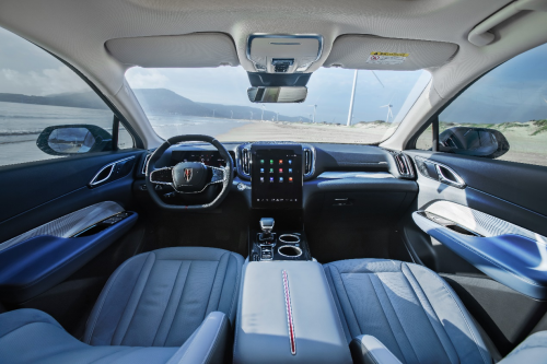 造型設計上,紅旗HS3前臉延續紅旗“飛翼”設計主題,大燈和飛翼融合貫穿,遠近光區域采用懸浮的車身色裝飾處理,整體極具運動感與科技感。走進車內,內部整體采用以駕乘者為中心的紅旗經典環抱式架構,以中控屏為對稱軸,振翅翱翔的特征趨勢展開至側面門板,彰顯出“中國氣派”的精致大氣。桶式座椅設計給予駕駛者極強的包裹感,流動多變的線條是運動與力量的體現,同時融入輕量化、鏤空設計,以迎合當下年輕化趨勢。超大尺寸全景天窗,采光效果極佳,帶來同級最強通透感受,讓用戶滿載一車陽光,愉悅出發。車內更有253色氛圍燈,為用戶打造了一處柔和多彩的休憩空間。