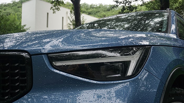 眼前這臺沃爾沃XC40是小改款車型,依舊是遵循了沃爾沃典型的家族式設計理念,標志性的雷神之錘大燈做了一些細微的變動,變的更有棱角。無論在白天還是夜晚,亮燈的那一刻都會令人過目不忘。全面黑化的專屬運動套件,前中網的點陣式裝飾更顯運動。