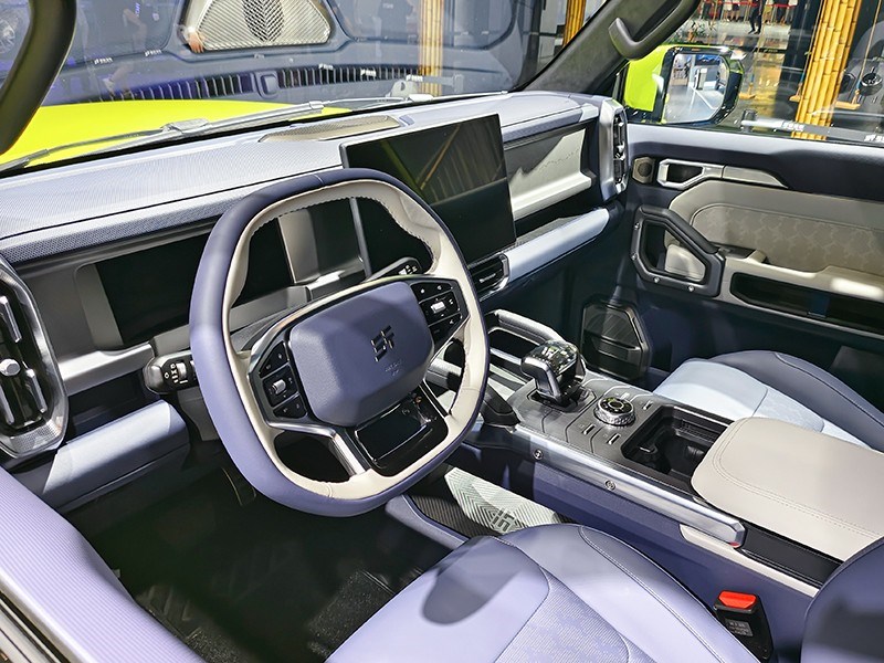 內飾方面,新車內飾采用撞色設計,并搭載8155智能座艙。新車提供上下平底的三輻式方向盤,除了撞色設計還自帶機甲風,在A柱上還有扶手把手及攝像頭。另外大尺寸的中控屏也有提供,除此還配了小巧的換擋把手。據悉新車還有涉水感應、拖車資質、自適應識別、自適應調節主動懸架等。