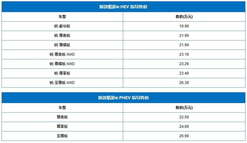 皓影e:PHEV中頂配售價上漲,配置保持不變。另外外觀配色增加酷黑 威尼斯藍雙色車身,內飾則其中黑白配色改為黑灰配色。