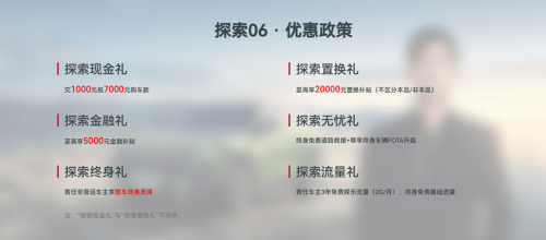更值得一提的是,探索06還為用戶準(zhǔn)備了豐厚的福利。現(xiàn)在入手即可享受交1000元抵7000元購車款、至高20000元置換補(bǔ)貼、至高5000元金融補(bǔ)貼等六重驚喜好禮。如今臨近春節(jié),感興趣的朋友可以去4S店試駕,用探索06開啟你的新一年旅途!