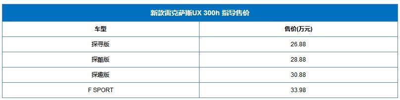 近日,新款雷克薩斯UX 300h上市,共推出4款車型,售價區間為26.88-33.98萬。