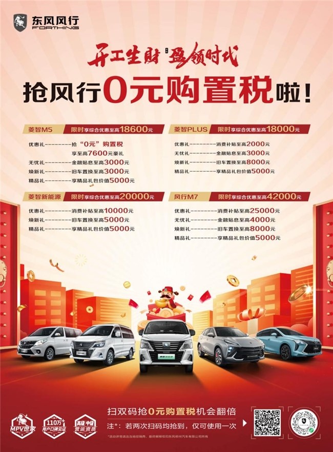 不僅如此,進(jìn)入風(fēng)行APP或公眾號(hào)掃碼進(jìn)入H5,即可參與抽獎(jiǎng),除了全免或半價(jià)專享購置稅抵扣券,更有驚喜開工紅包,助力用戶元?dú)鉂M滿,開工大吉。