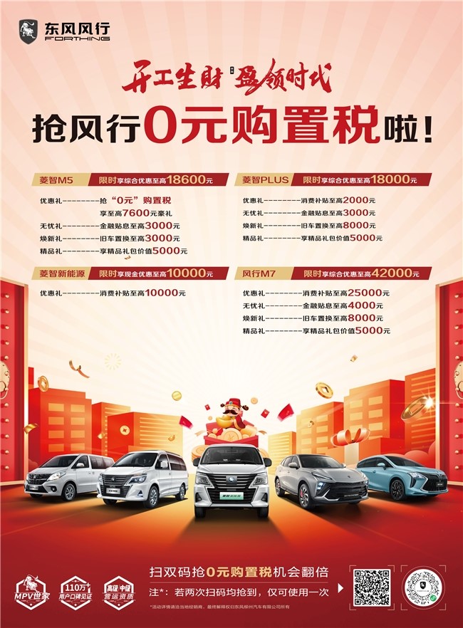 菱智家族除了為眾多消費者帶來幅度驚人的購車優惠外,還推出了豐富的福利。用戶只需在風行APP或公眾號,找到風行0元購置稅活動,又或者在本文的宣傳海報上,掃碼進入H5即可參與抽獎,輕松獲得驚喜開工紅包或菱智專享購置稅抵扣券。其中開工紅包中獎即可領取,為廣大消費者提供驚喜。