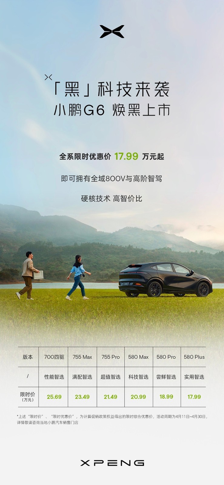 4月11日,小鵬G6新增入門版車型上市,并開啟限時(shí)優(yōu)惠價(jià),售價(jià)17.99萬。