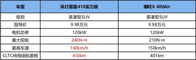 近幾年,新能源汽車市場越來越卷,價格戰一波未平一波又起。近日,特斯拉就宣布在全球范圍內進行大降價,部分車型價格下調達1.4萬元,這無疑又加重了市場的火藥味!不得不說,在當下競爭十分激烈的新能源市場中,只有產品力強、性價比高的車型,才能贏得消費者青睞,而在10萬級純電SUV這個細分市場里,風行雷霆410實力版和哪吒X 400Air就是兼具實力和性價比的明星車型,那么,強強相遇,誰會更強呢?我們就來比一比,看誰更能打!