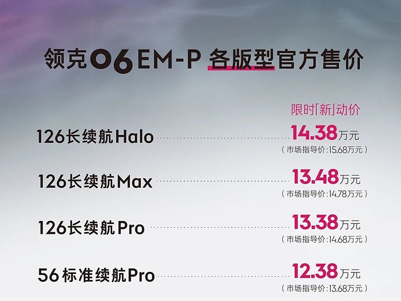 領克06 EM-P新增126長續航Max上市,售價14.78萬。同時全系開啟限時優惠。
