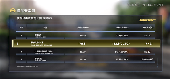 在純電續航測試環節中,懂車帝將路線設置在北京三環和四環,全程平均車速控制在30-35公里/小時。經懂車帝測試,長安UNI-Z的純電續航里程達179.8公里,大幅超出其CLTC工況下標稱的125公里,續航達成率達143.8%,而在WLTC工況下其續航達成率更是高達189%。如此大幅度的反向虛標,長安UNI-Z堪稱汽車界的純電續航“虛標王”。該成績不僅優于一同測試的零跑C10、深藍S7和比亞迪宋PLUS DM-i,也較宋PRO DM-i實測的141.3公里純電續航有明顯優勢。