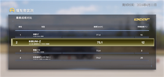 麋鹿測試是國際上衡量車輛安全性和操控穩定性的重要標準之一,考驗汽車的緊急避讓能力和電控系統的標定。此次實測中,懂車帝也對長安UNI-Z進行了相關測試。在測試中,長安UNI-Z始終保持車身姿態穩定,未出現兩車輪同時離地或車身大幅彈跳等危險姿態,即便將車速提高到85公里/小時,車身姿態依然保持穩定安全狀態。經多次測試,長安UNI-Z最終取得了75.1公里/小時的最高通過速度,優于宋PLUS DM-i和零跑C10,較宋PRO DM-i 70.2公里/小時的最高通過速度更是優勢明顯。