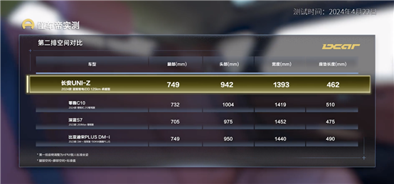 懂車帝也通過HPM標準測試假人對長安UNI-Z的空間表現進行了實測。測試顯示,長安UNI-Z表現優秀,第一排高度989mm,用戶最為關注的第二排腿部空間也達到了749mm,膝部空間接近兩拳。相較于其他競品,長安UNI-Z與宋PLUS DM-i的第二排腿部空間在此次測試中并列第一。