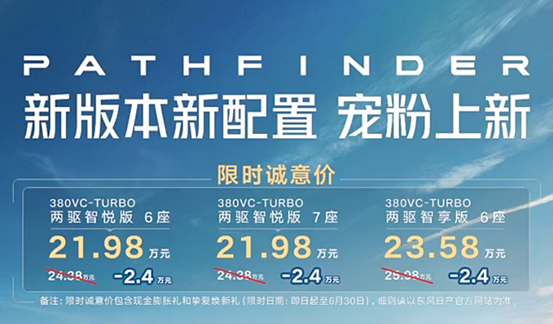 6月11日,東風(fēng)日產(chǎn)探陸新增3款車型上市,售價24.38-25.98萬。同時還開啟限時誠意價,為21.98-23.58萬。