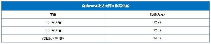 近日,奇瑞2024款艾瑞澤8上市,共推出3款車型,售價區間為12.29-14.89萬。