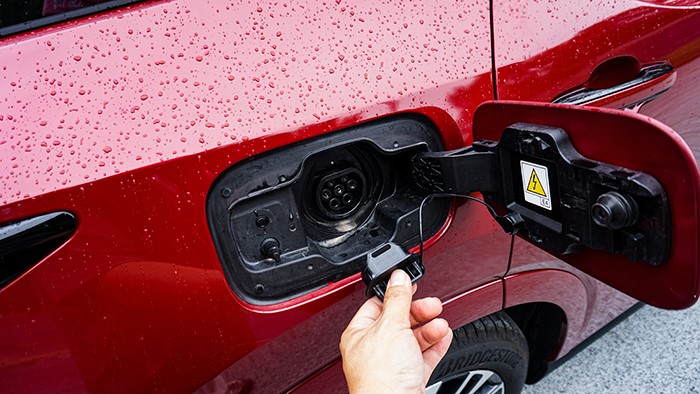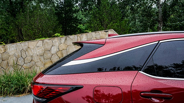 經典的懸浮式C柱在視覺上非常有辨識度,而那條鍍鉻飾條可謂功不可沒,讓車身側面顯得非常流暢,也是得益于這個出色的c/d柱設計,車身沒有太大的突兀感。另外,右后側安排了充電接口。