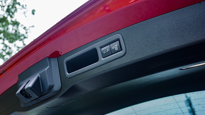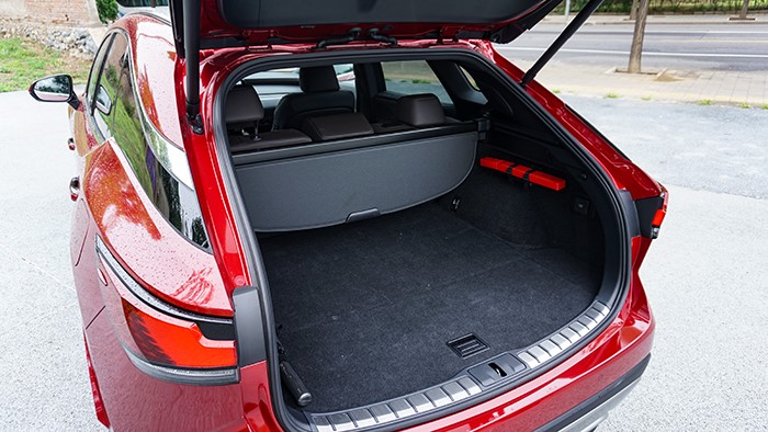 尾燈造型采用了貫穿式一體化造型,視覺效果十分精致。235/50 R21的輪胎配合車身尺寸剛好,電動后備箱蓋升起后可看到RX450h+的后備箱平臺非常規整,并帶有后排座椅電動折疊開關。