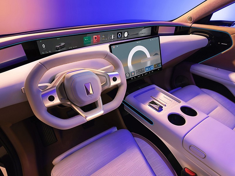 內飾方面,車內取消大量實體按鈕,配備大尺寸懸浮式中控屏搭配上下平底三輻式方向盤。在上方還有一塊貫穿式窄條幅屏幕以及左右兩塊電子外后視鏡顯示屏。新車還提供手機無線充電、氛圍燈等。
