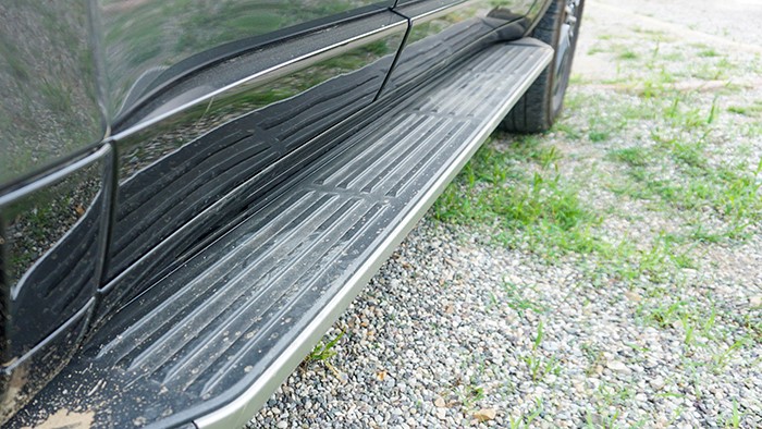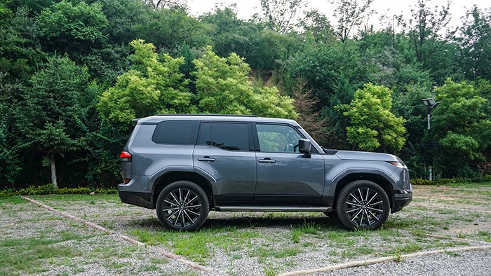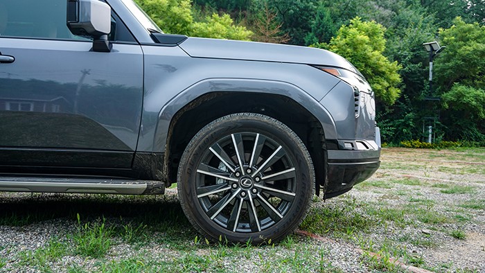 GX550h凌峰版使用了22寸輪轂,輪胎規格為265/50 R22,品牌為鄧祿普,作為一臺硬派越野車實屬不小。大尺寸的車輪增加了整體的視覺沖擊力,同時也提升了車輛的運動感和豪華感。為了上車方便,腳踏板也是原廠配置。