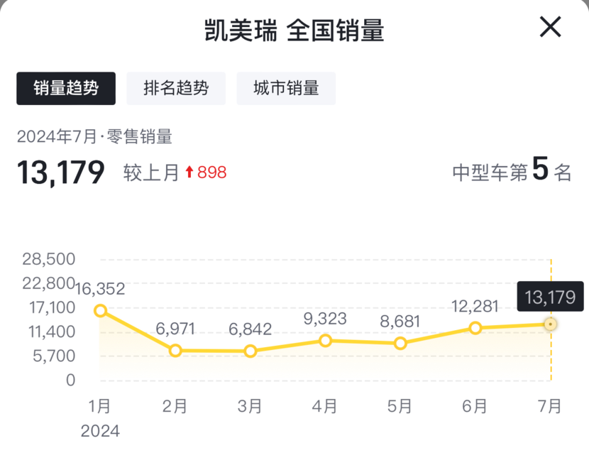 自古真情留不住,唯有降價(jià)得人心!前幾個(gè)月都說(shuō)新款凱美瑞不行了,可如今凱美瑞的銷量又支棱起來(lái)了!年初的時(shí)候,新款凱美瑞的月銷量只有6000多,可在剛剛過去的七月份,凱美瑞的月銷量又攀升到了13,179輛。這銷量不算特別出眾,但也能排進(jìn)B級(jí)車中的銷量前五了。