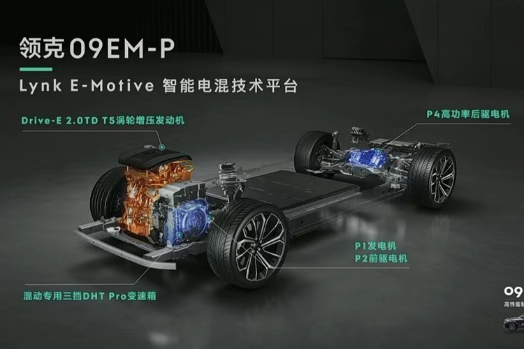 雖然目前官方暫未披露具體信息,但個人猜測很可能是類似領克09 EM-P的電混技術,包括重新調校的2.0T混動專用發動機,以及前橋P1 P2雙電機(也有可能是類似領克08的P1 P3雙電機),外加獨立后橋P4電機驅動。