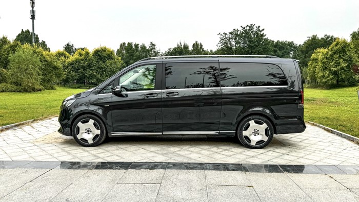 車身側面:奔馳V300L的車身線條流暢自然,腰線優雅流暢,整體視覺效果非常舒展。鍍鉻裝飾條點綴在車窗下沿,凸顯出豪華感。這臺長軸距版本的車身尺寸為:5370*1928*1920mm,軸距3430mm。V級還有標準軸距車型可選擇:5140*1928*1920mm,軸距3200。