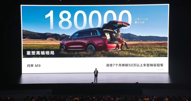 隨著近幾年自主品牌技術的不斷進步和創新,自主品牌開始逐漸打破這一局面。問界M9的出現,正是這一轉變的縮影。從去年12月底發布至今,問界M9累計大定量已經突破了18萬輛。并且從11月11日官宣大定突破17萬輛到如今大定突破18萬輛,僅僅用時15天。更重要的是,問界M9的成交均價超過了55萬。這一數據充分證明了消費者對問界M9高端科技配置和豪華品質的高度認可。