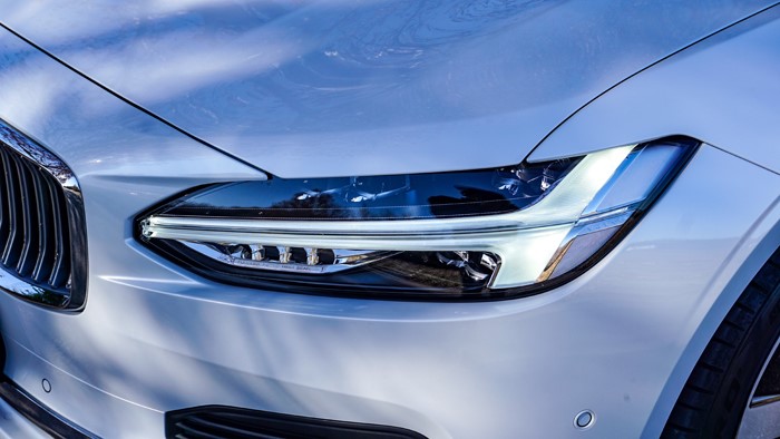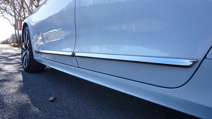 沃爾沃S90的安全確實非同凡響。首先說車身安全方面。它采用比競爭對手更大的硼鋼材料,面積達到37.6%,這是以硼為主要合金化元素的鋼 ,其硬度可達到1,300~1,500Mpa,是一般車身鋼材硬度的4~5倍。在同等強度下,質量要輕15%。左前翼子板上的充電口證明這是臺插混車型。