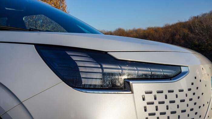 全封閉的前臉上所有裝飾件都可以發(fā)光,并且是有節(jié)奏規(guī)律的點亮,很有儀式感。這些由密到疏的點陣式鍍鉻裝飾很有星際的感覺,離近了觀察,是背部暗藏了發(fā)光光源。前杠下端還鑲嵌了整根鍍鉻裝飾,提升豪華感。