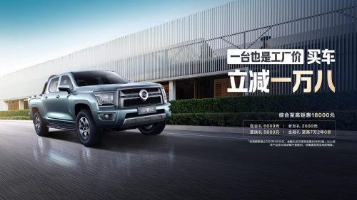 金剛炮8AT不僅有硬核實力,更有誠意滿滿的價格,售價9.98萬元起,用戶花手動擋的錢就能買到自動擋皮卡。同時,金剛炮終端優惠力度空前,一臺也是工廠價,買車立減一萬八,性價比直接拉滿。即日起至4月30日,購買金剛炮限時綜合鉅惠至高18000元,可享6000元現金禮、2000元老友禮、5000元置換禮,以及至高7萬2年0息等諸多禮遇……福利多多,相比同級車型簡直不要太劃算。