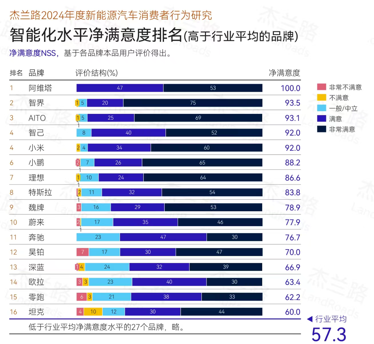 而根據(jù)杰蘭路2024年度新能源汽車消費(fèi)者行為研究,AITO在“智能化水平凈滿意度排名(高于行業(yè)平均的品牌)”榜單中位列前列,其中“非常滿意”在評價結(jié)構(gòu)中的占比高達(dá)69%。這一優(yōu)異成績,無疑進(jìn)一步印證了問界新M7的行業(yè)影響力和用戶口碑。
