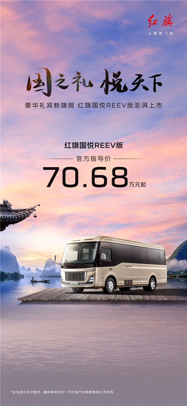 2025年3月25日,風(fēng)景如畫的桂林畔,“國之禮 悅天下”紅旗國悅REEV上市暨品牌文化體驗之旅活動隆重舉行。紅旗國悅REEV正式上市,官方指導(dǎo)價70.68萬元起。紅旗國悅REEV以“零焦慮、全場景、高舒適”為核心競爭力,通過東方禮序美學(xué)與尖端科技的深度融合,重構(gòu)航旅業(yè)高端出行生態(tài),開啟中國新能源禮賓車新篇章。