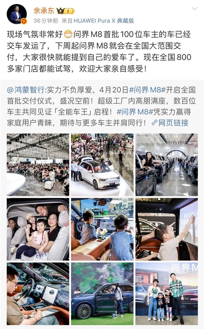 4月20日,問界M8全國首批用戶交付儀式在重慶賽力斯超級工廠舉行。此次交付儀式首次實現(xiàn)百組家庭聯(lián)合交付,開創(chuàng)了行業(yè)先河,并重新定義了智能汽車交付標(biāo)準(zhǔn)、交付效率,并展現(xiàn)華為與賽力斯協(xié)同的產(chǎn)能實力與用戶責(zé)任感。華為常務(wù)董事、終端BG董事長余承東發(fā)布微博稱:“問界M8首批100位車主的車已經(jīng)交車發(fā)運了,下周起問界M8就會在全國大范圍交付,大家很快就能提到自己的愛車了。”